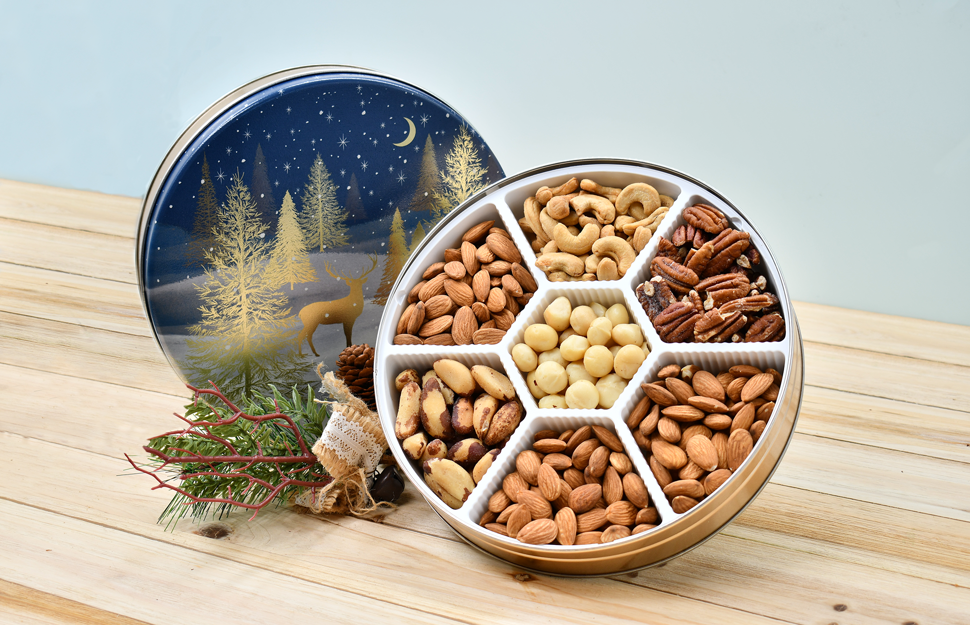 7 Compartment Contents: (1.12lbs) Almonds, Cashews, Walnuts, Brazil Nuts, & Macadamia Nuts. All in a Holiday “Gilded Forest” Keepsake Tin – Perfect gift for any occasion to give to family, friends, and co-workers.